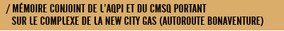 Mémoire déposé conjointement par l'Aqpi et le Conseil des monuments et sites du Québec (CMSQ) à l'Office de consultation publique de Montréal (OCPM) le 6 janvier 2010. Ce mémoire concerne essentiellement la place du complexe de la New City Gas au sein du projet de réaménagement de l'autoroute Bonaventure.